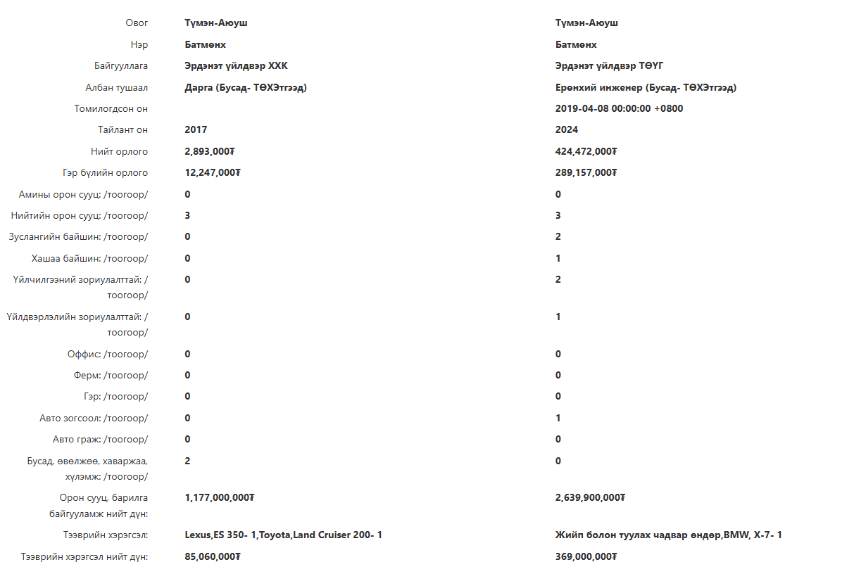 "Эрдэнэт үйлдвэр”-ийн Ерөнхий инженер Т.Батмөнх жилийн 424 сая төгрөгийн орлоготой, 2.6 тэрбум төгрөгийн гурван орон сууц, үйлчилгээний гурван барилга, зуслангийн хоёр байшинтай. Дээрээс нь 369 сая төгрөгийн "BMW-X6” автомашинтай, 234 сая төгрөгийн газар, 390 сая төгрөгийн үнэт эдлэл, 417 сая төгрөгийн мал, 94 сая төгрөгийн хадгаламж, 484 сая төгрөгийн авлагатай нэгэн ажээ. Харин тэр 2017 онд жилийн 2.8 сая төгрөгийн орлоготой, гэр бүлийн орлого нь 12 сая төгрөг байжээ. Нийтийн гурван орон сууцтай, үнэлгээ нь 1.1 тэрбум байж. Мөн 85 сая төгрөгийн үнэлгээтэй хоёр автомашинтай, 680 мянган төгрөгийн малтай, өмчлөх эрхийн таван сая хоёр газартай байжээ. Үнэт эдлэл нь 390 мянган төгрөг, авлага нь 200 мянган төгрөг байсан байна. Эндээс уншигч та Т.Батмөнхийн хөрөнгө найман жилийн дотор хэрхэн өссөнийг тунгаана биз ээ.