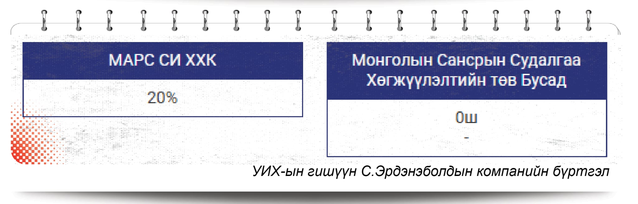 УИХ-ын гишүүн С.Эрдэнэболд "Марс си” ХХК-ийг Амарын Мөнхнаст, Батбилэгийн Агваанцэрэн, Бадарчийн Одбаясал, Гинжбаатарын Амгаланбаяр нартай хамтран эзэмшдэг. Уг компани нь барилга, аялал жуулчлалын чиглэлээр үйл ажиллагаа явуулдаг. Мөн С.Эрдэнэболд нь эхнэр Д.Уранзаяатайгаа "Тусч ногоон гар” ТББ, "Жак-Уэтерфорд сан”, "Марс Ви” санг хамтран эзэмшдэг. Эдгээр сан нь түүх судлалыг хөгжүүлэх, залуу судлаачдыг дэмжих, сансрын технологи, инновацийг дэмжих, энэ төрлийн судалгаанд хөрөнгө оруулалт хийх, сансрын тухай марс гарагтай холбоотой шинжлэх ухааны мэдээ, мэдээллийн сан үүсгэх, иргэдэд хүргэх, судалгаа, шинжилгээний төсөл хэрэгжүүлэх төрлийн бизнес эрхэлдэг.
