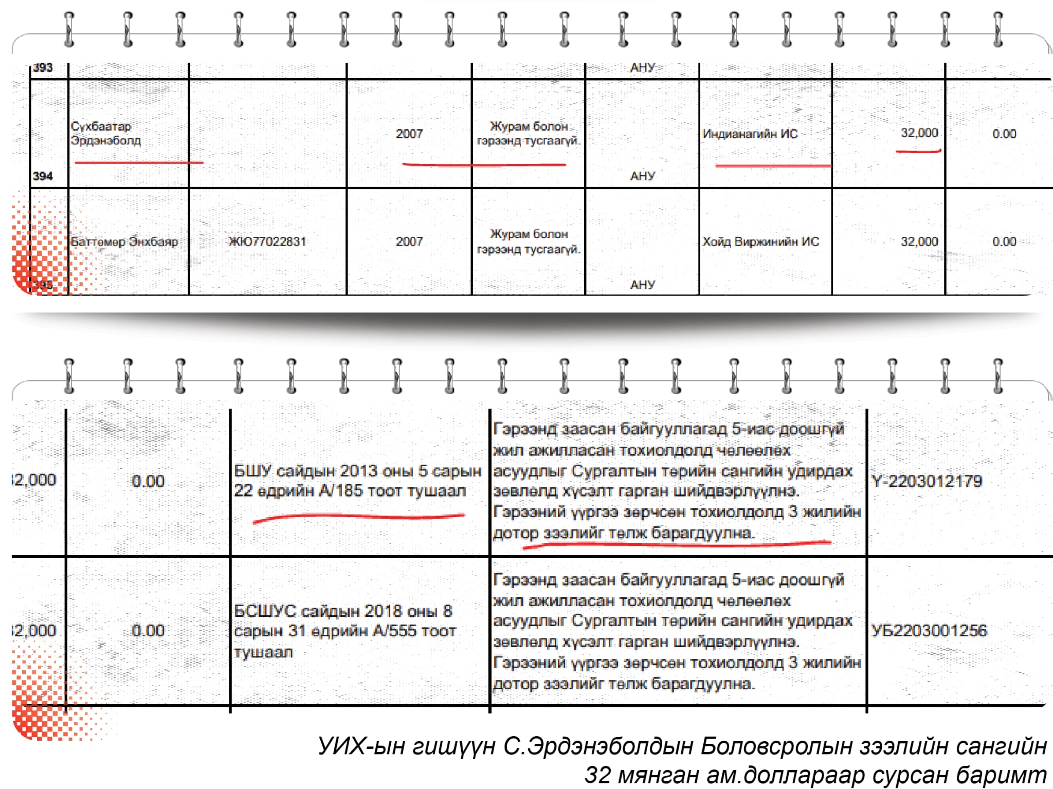 ЛУ.БОЛДЫН “ТАВИУЛ” УИХ-ЫН ГИШҮҮН С.ЭРДЭНЭБОЛД БОЛОВСРОЛЫН ЗЭЭЛИЙН САНГААС 32 МЯНГАН АМ. ДОЛЛАРЫН ЗЭЭЛ АВЧ СУРААД, Ц.ЭЛБЭГДОРЖИЙН “ЦЭРЭГ”-ЭЭР ЗУРГААН ЖИЛ АЖИЛЛАЖЭЭ